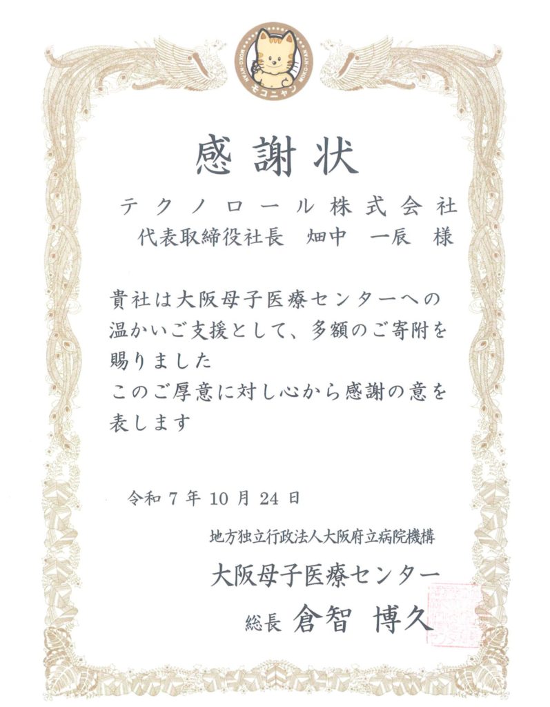Our company recently made a donation to the Osaka Women’s and Children’s Hospital and received a letter of appreciation in recognition of our support.